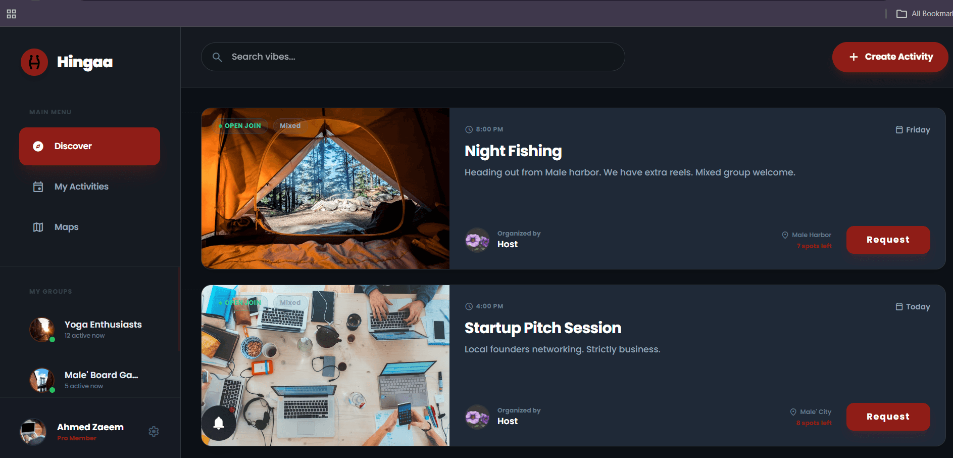 Hingaa is a social app that helps people find and join real-life activities happening nearby. No more awkward intros, just meet new people by doing fun things together! Playing sports, grabbing food, or going on random side quests.
