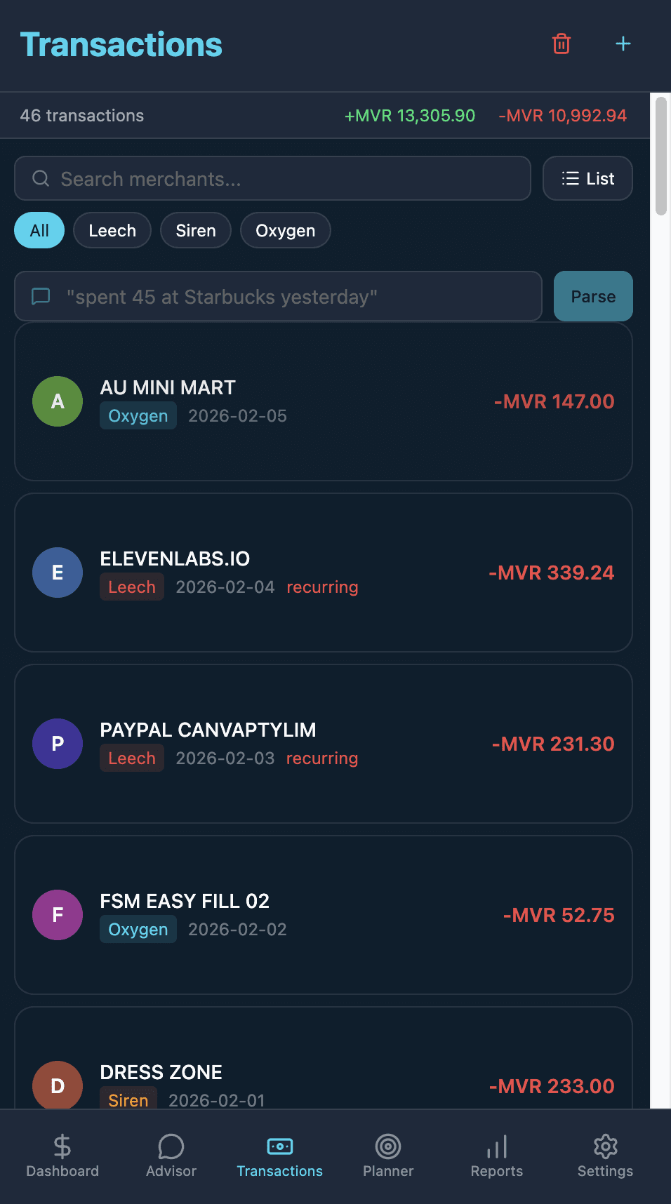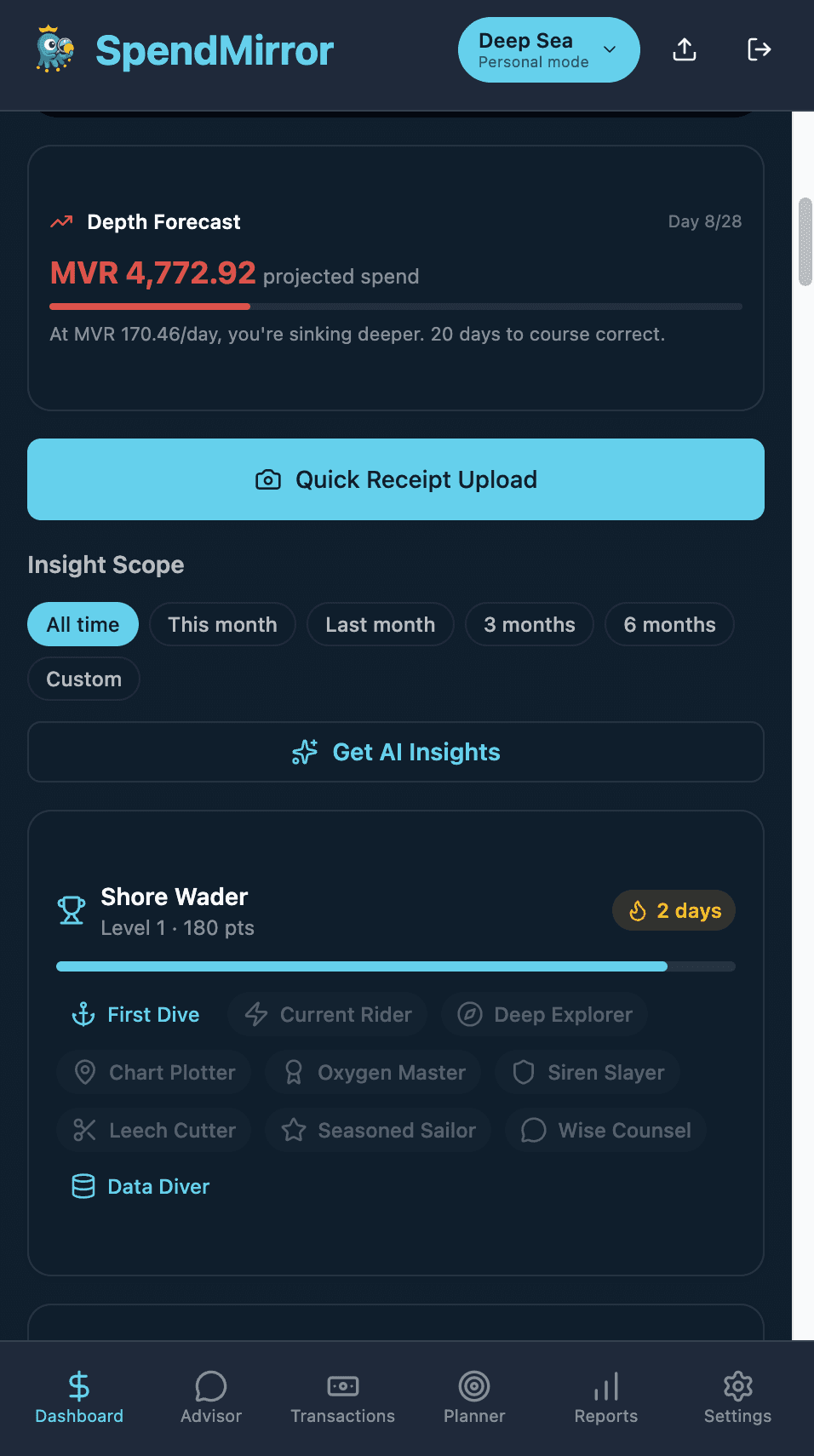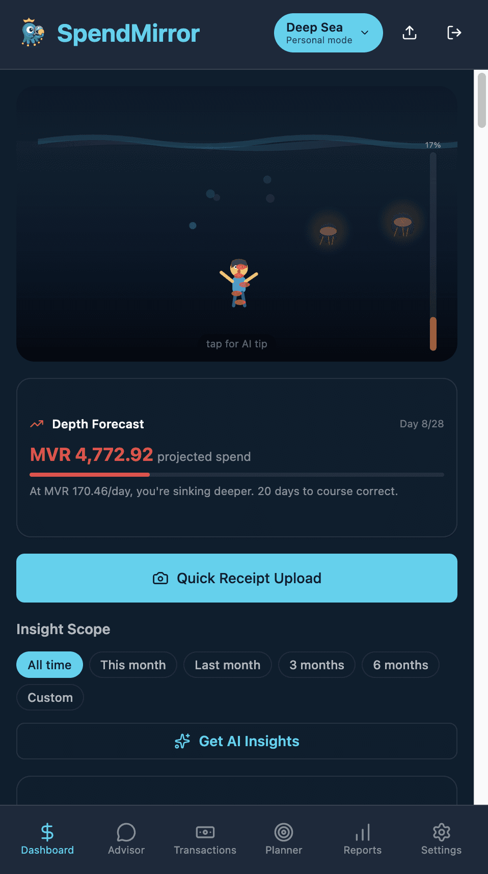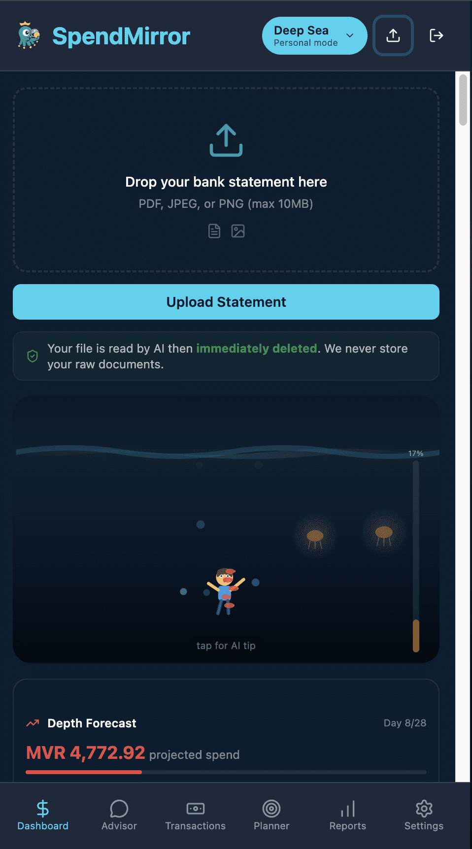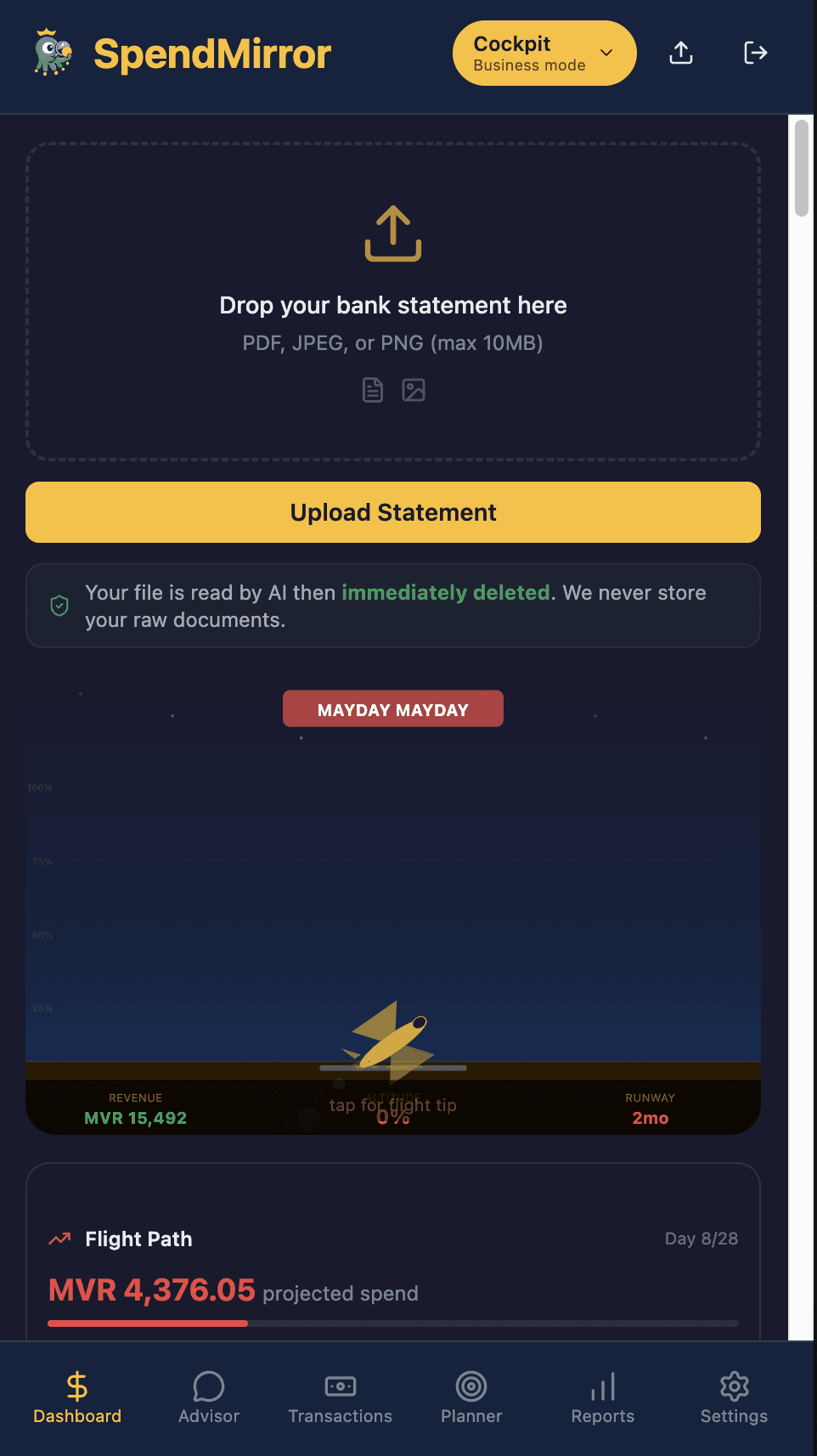 The solution: SpendMirror turns your bank statements into a living monopoly game. Upload a PDF — AI parses it instantly, then shows you a swimmer running out of oxygen (personal) or a plane losing altitude (business). Tap for a one-line AI tip. Spot the leeches draining your wallet. No dashboards to study — just glance and act.