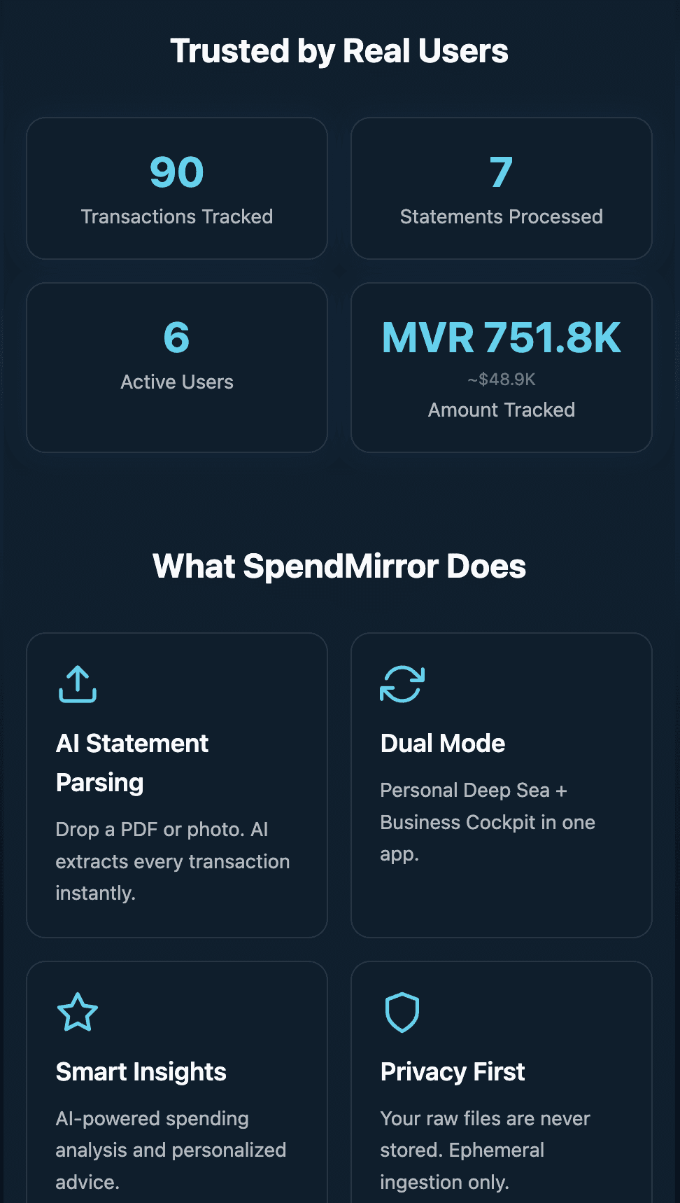 SpendMirror — Upload any bank statement, AI extracts your transactions instantly and deletes the file. Your finances become a game: play Monopoly with real money, quiz your spending habits, and get plain-English AI advice. Privacy-first. Fun-first.