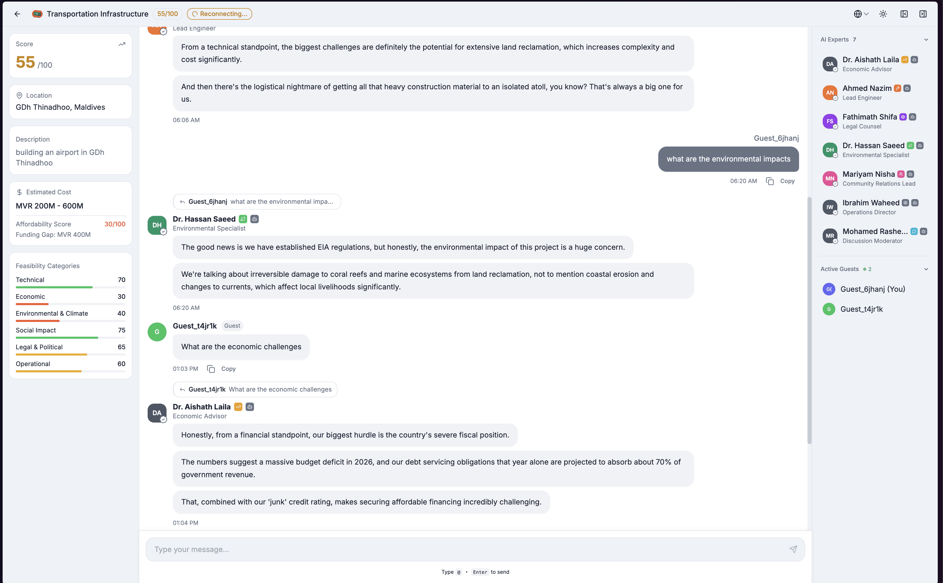 Expert AI Chat: Don't just read a report—discuss the intricacies of your project with specialized AI agents in Engineering, Law, and Finance.